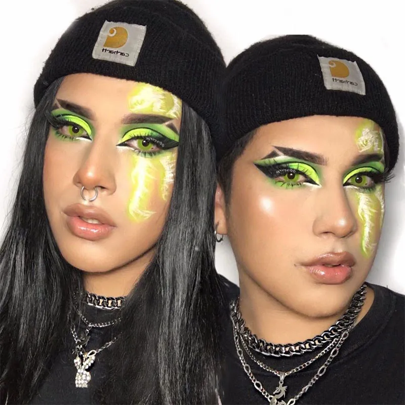 Distinct in their design, cat-eye colored contacts mimic the vertical pupil shape characteristic of feline eyes, adding an exotic allure to your gaze. They've transcended their initial association with fantasy and costume play, becoming a bold fashion statement. With these contacts, you can add an element of intrigue and drama to your look without uttering a single word.